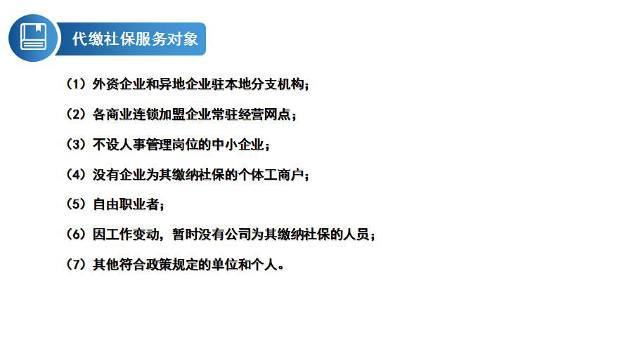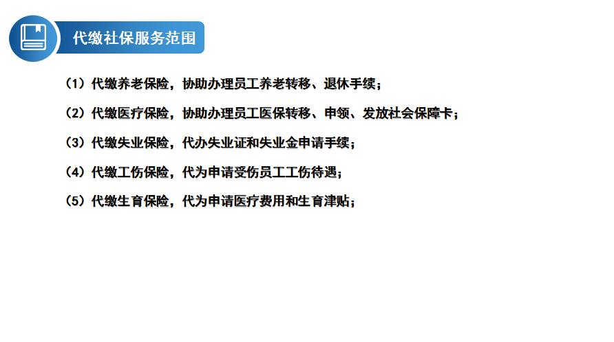代缴社保是社保代理服务的主要内容,指代理公司为企业或个人提供代办或缴纳社会保险的服务,是人事代理服务中众多项目之一。